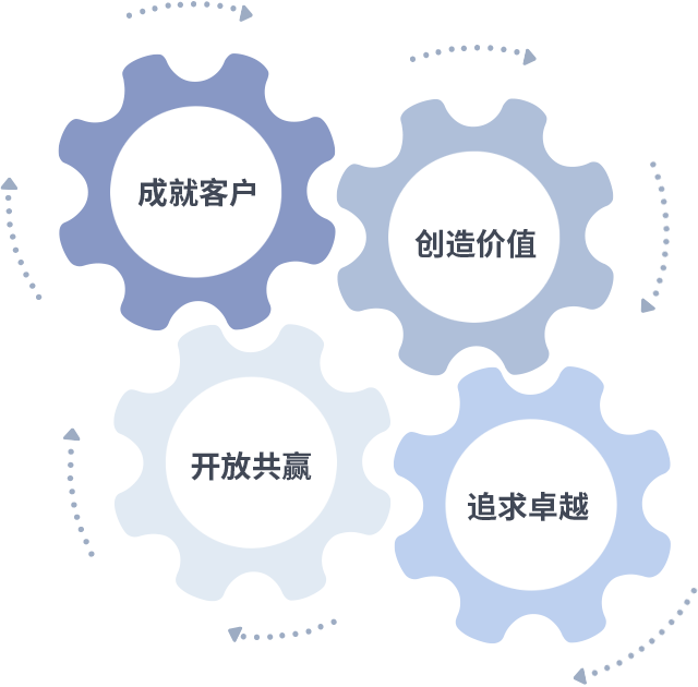 成就客户是一切决策的出发点,创造价值是衡量所有工作的标准,追求卓越是3118云顶集团做事做人的态度,开放共赢是3118云顶集团的格局也是最终的结果。价值观的齿轮环环相扣,推动着组织里的每个人不断向前。